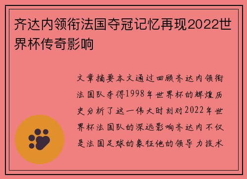 齐内丁·齐达内:带领法国走向辉煌的世界杯传奇